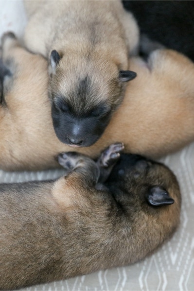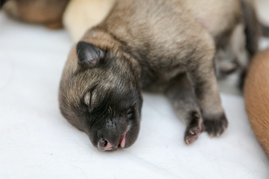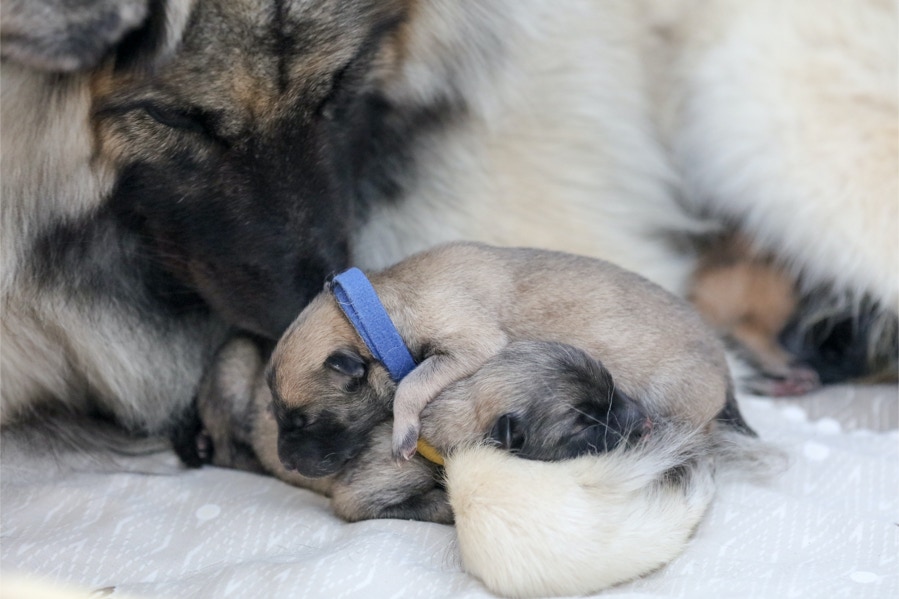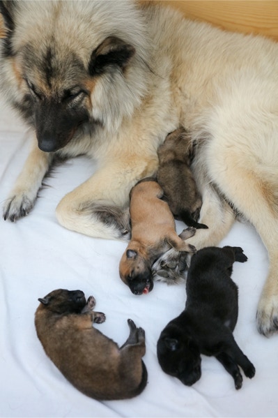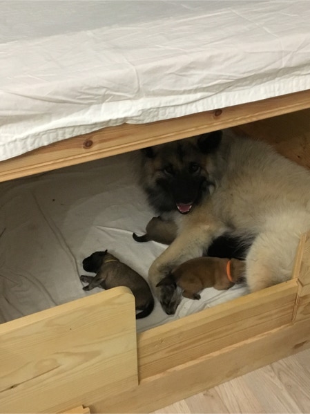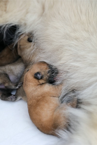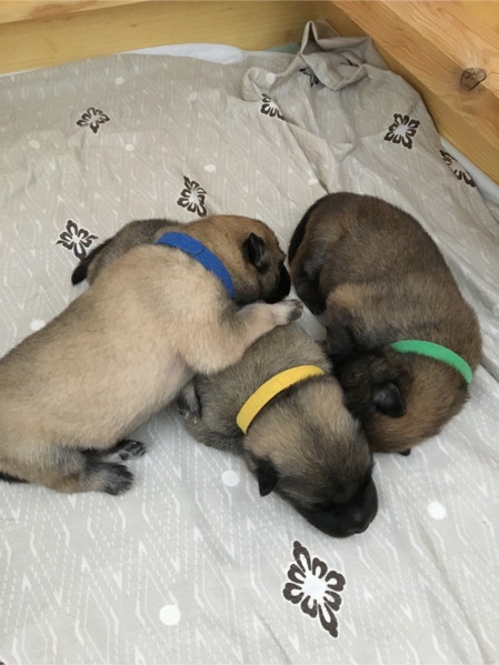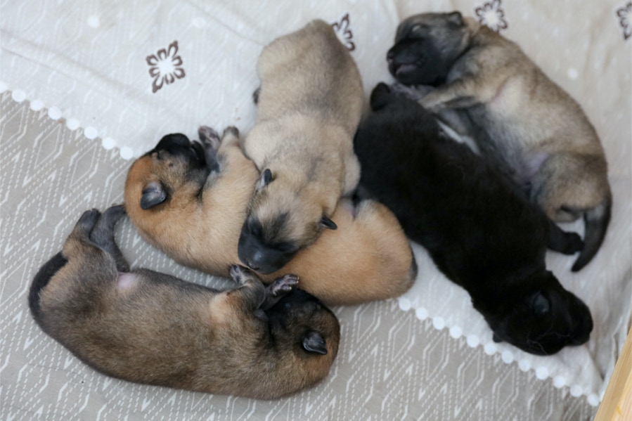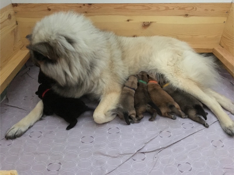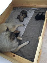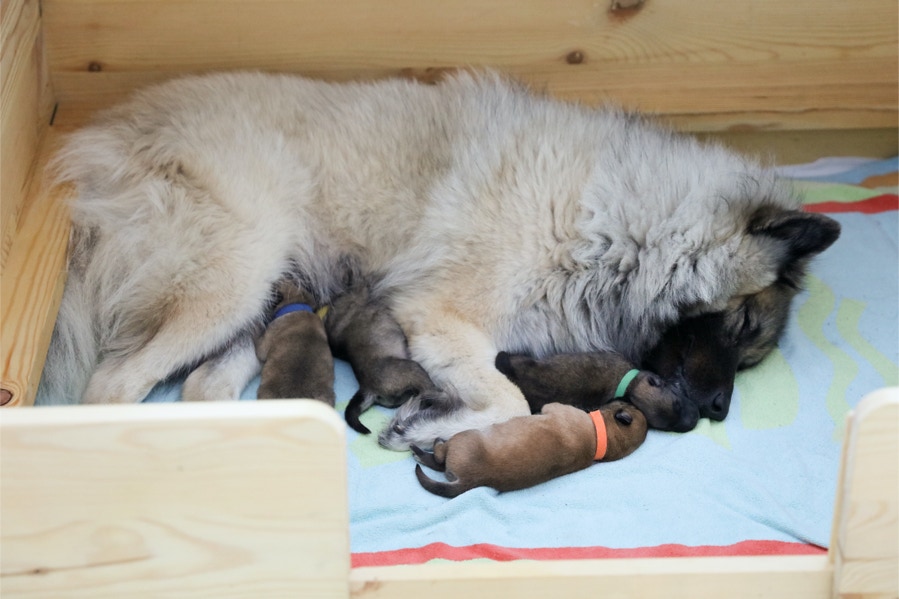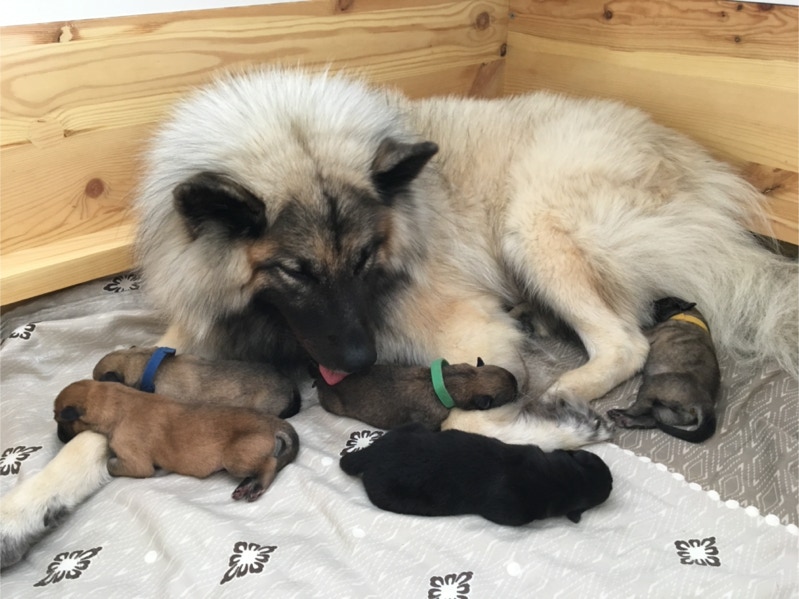 Alle Welpen entwickeln sich prächtig. Sie nehmen gut zu und sind sehr munter. Mama Akina Luh kümmert sich sehr gut um ihre Kleinen. Sie ist aufmerksam und gönnt sich jetzt auch mal eine kleine Pause außerhalb der Wurfbox.